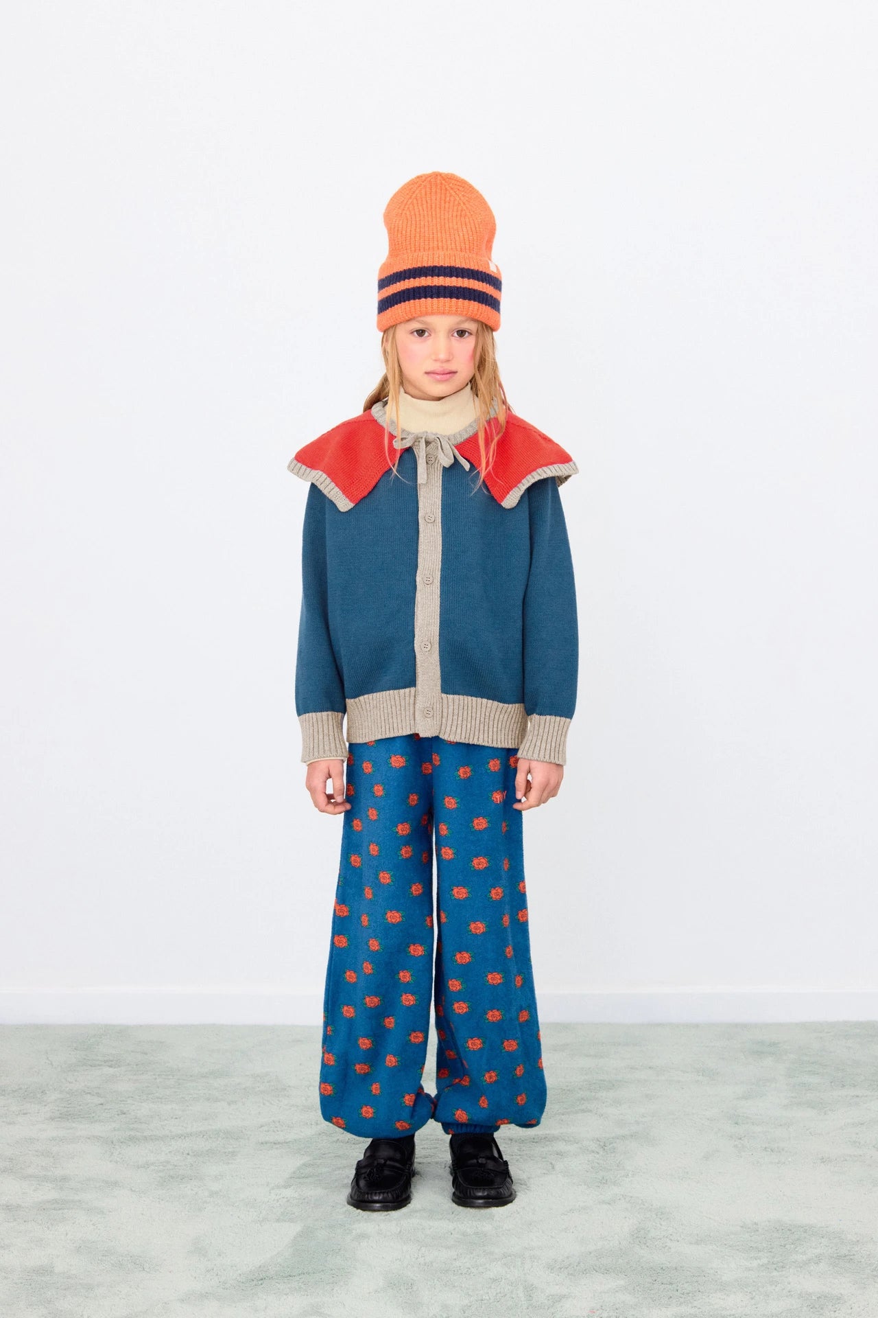 This color block cardigan, made of a soft wool blend, adds a playful touch to a classic silhouette with a distinctive, large rounded crew neck. Featuring a button-front opening, a fixed bow, and ribbed cuffs, it combines cozy comfort with unique style—perfect for layering on cooler days.