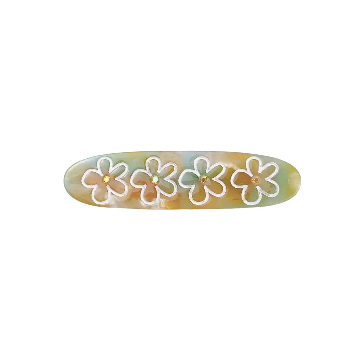 Greenish-yellow acetate with white ink inlay, citrine iridescent rhinestone center, and gold alligator clip on back