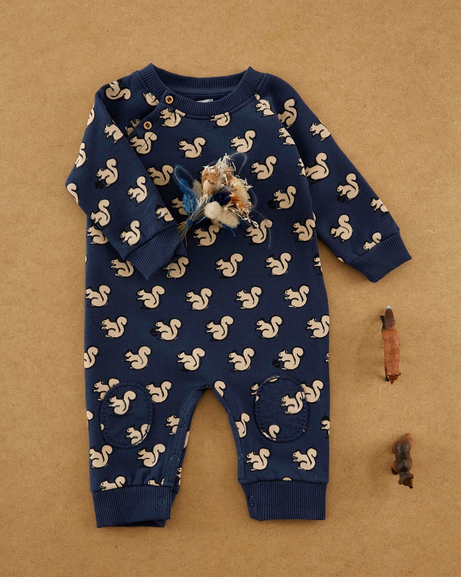 Midnight blue organic cotton jersey jumpsuit with brushed fleece and all-over cream squirrel print.